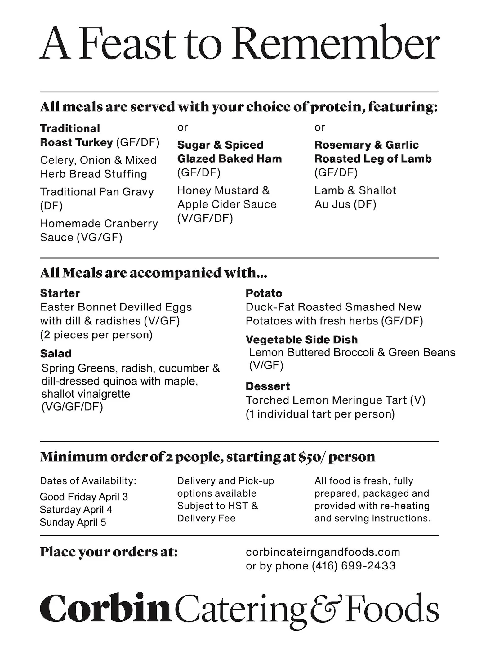 Celebrate Easter this year with ease—let Corbin Catering & Foods provide you with the Ultimate Meal Pack. Your only responsibilities? Invite your loved ones, set the table, and heat up your oven.